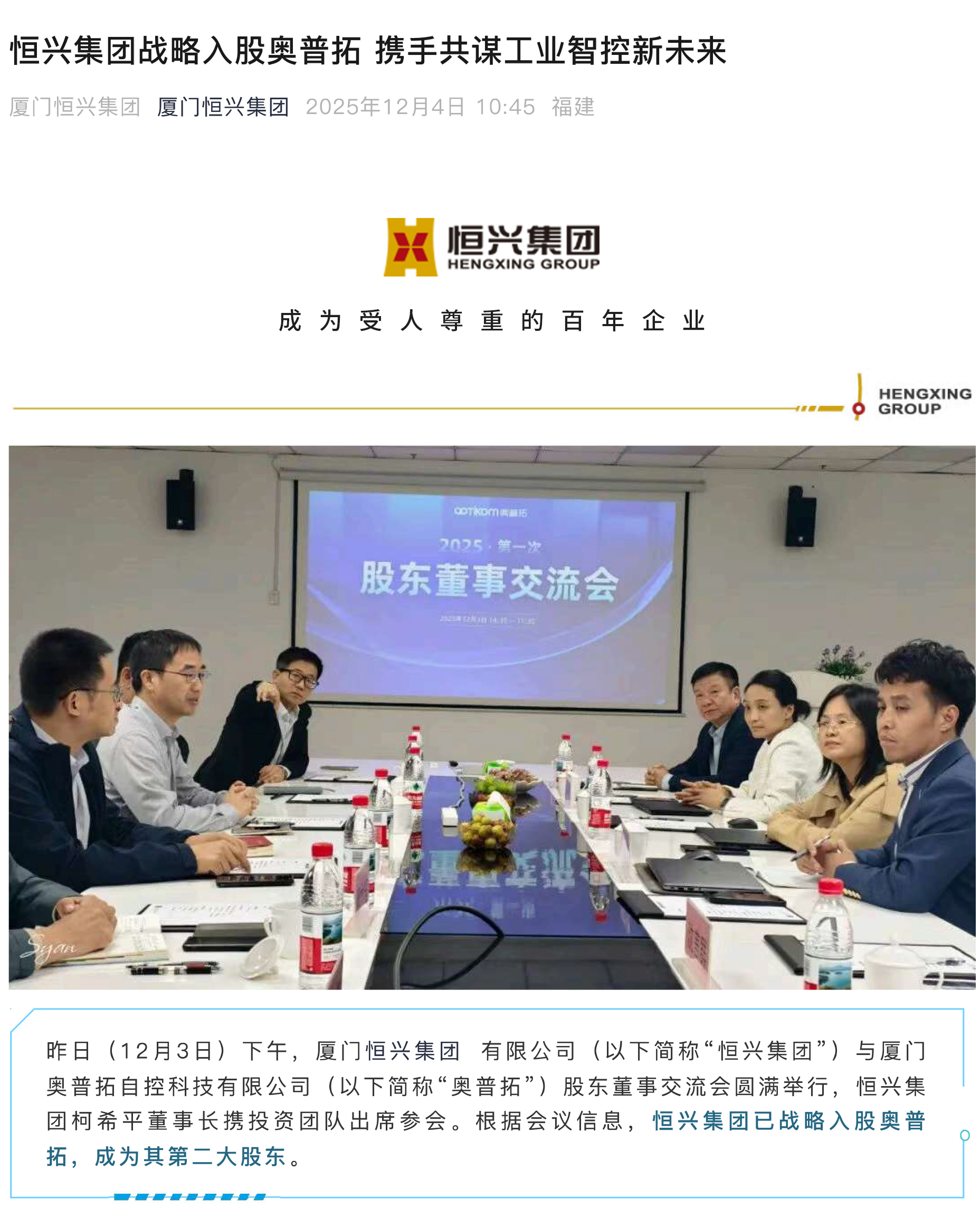 战略合作 | 恒兴集团战略入股奥普拓 携手共谋工业智控新未来